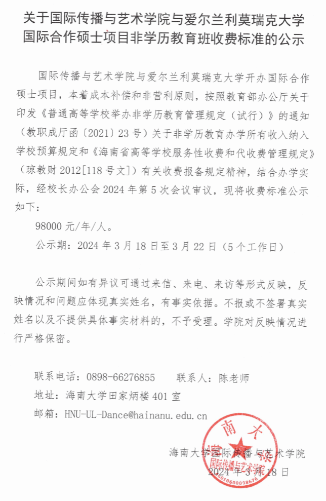 关于伟德BV官网与爱尔兰利莫瑞克大学国际合作硕士项目非学历教育班收费标准的公示