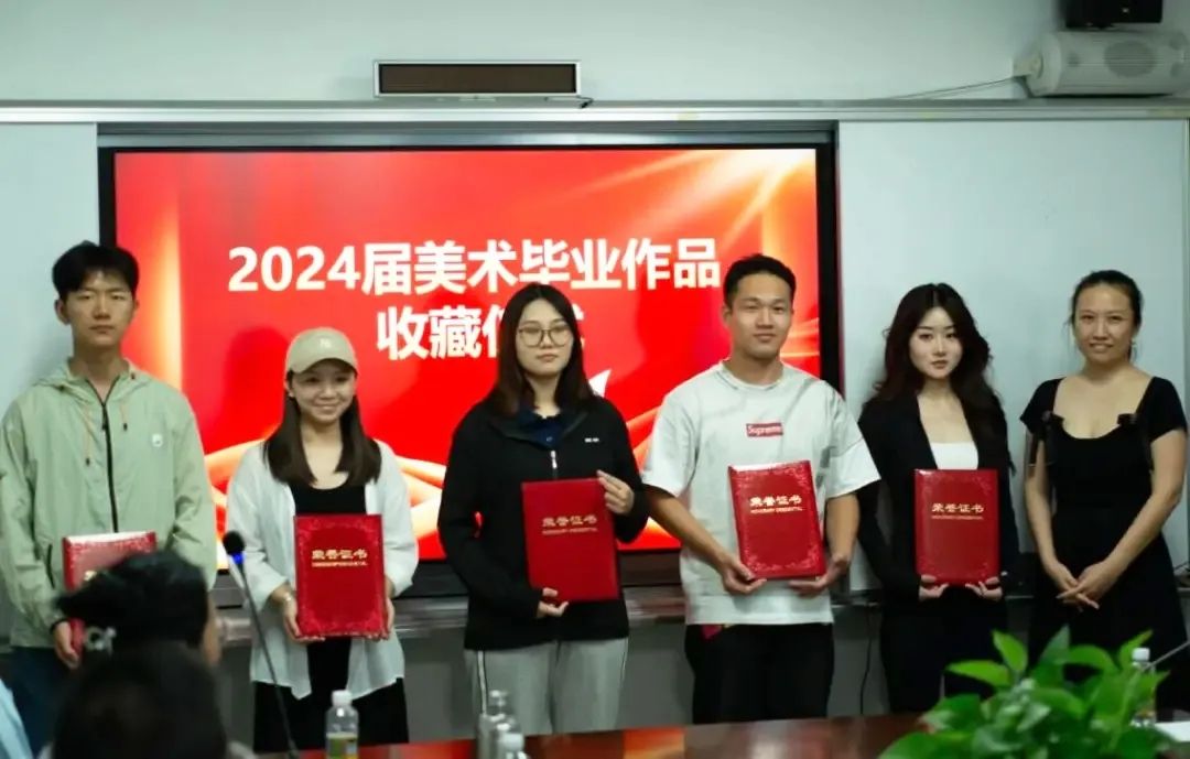 仪式上,郑立波经理对毕业生的艺术才华和努力表示高度赞赏,强调公司对美术教育的重视和对员工创作成果的认可。他对2024届毕业生的美好未来提出了殷切希望,并分享自己大学故事和生活感悟。他说,作品被公司收藏是一种荣耀,更是连接母校的情感纽带,为自己的一生种下美好记忆的种子。他希望同学们记住这个时刻,以此为起点在艺术之路上不要试图走小路、近路,而是要走大道,以开放包容的心态对待艺术和人生。参加收藏仪式的同学代表表达了自己对公司、公司和老师的感激之情,表示自己的作品能被公司收藏感到非常荣耀,对自身是很大的激励,感恩老师们的培养和指导。
