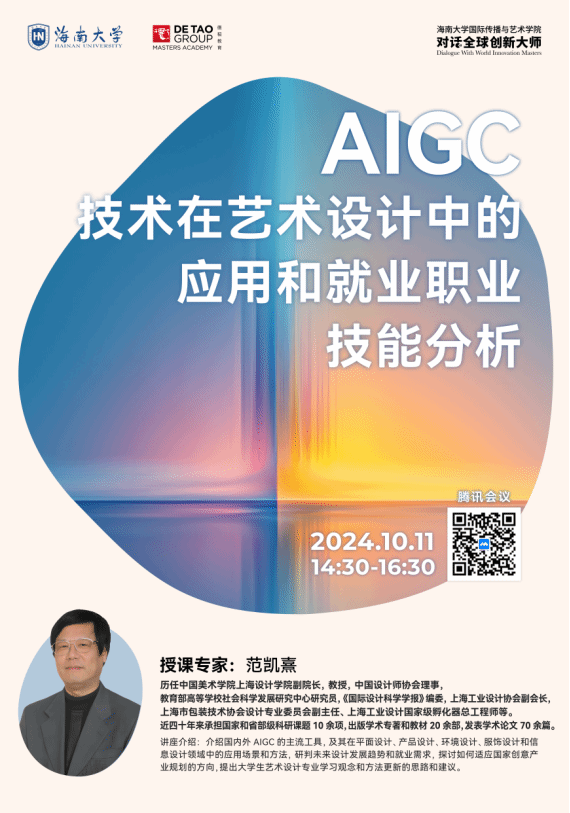 10月11日14:30,2024“对话全球创新大师讲座”《AIGC技术在艺术设计中的应用和就业职业技能分析》在线上举行,由中国美术公司范凯熹教授主讲,设计系专业教师李珂博士担任学术主持,线上线下共100名左右师生同时参与。