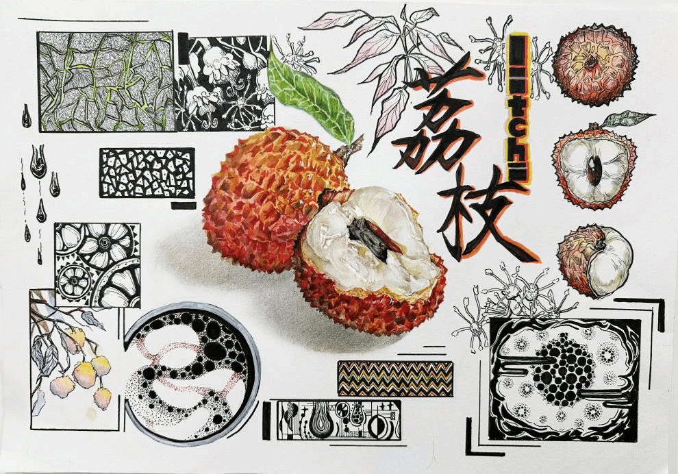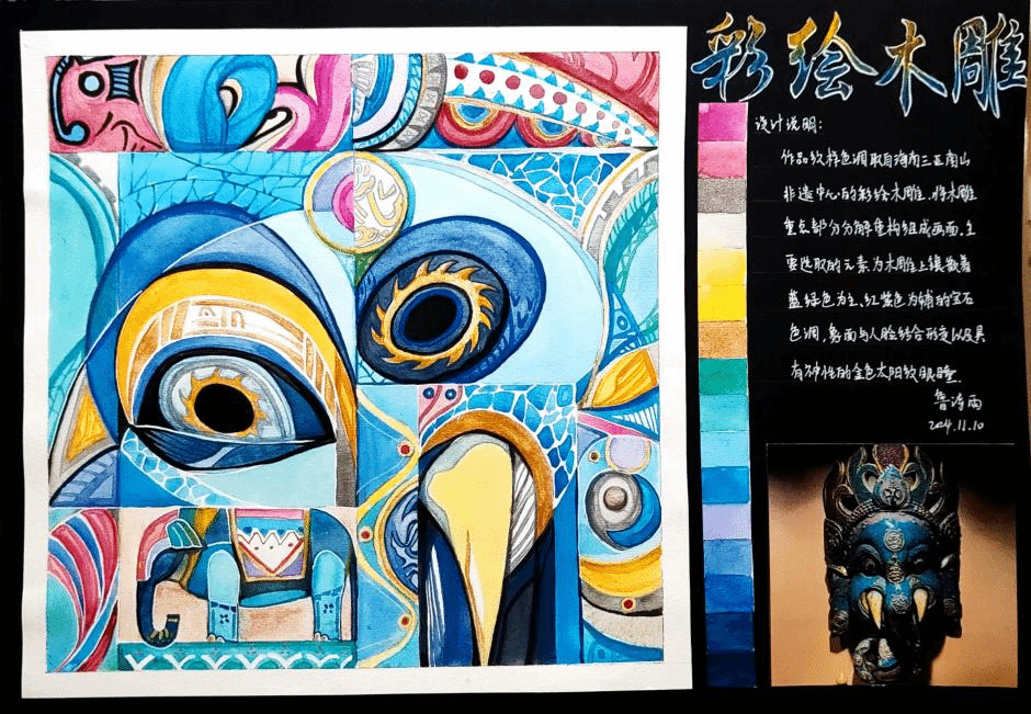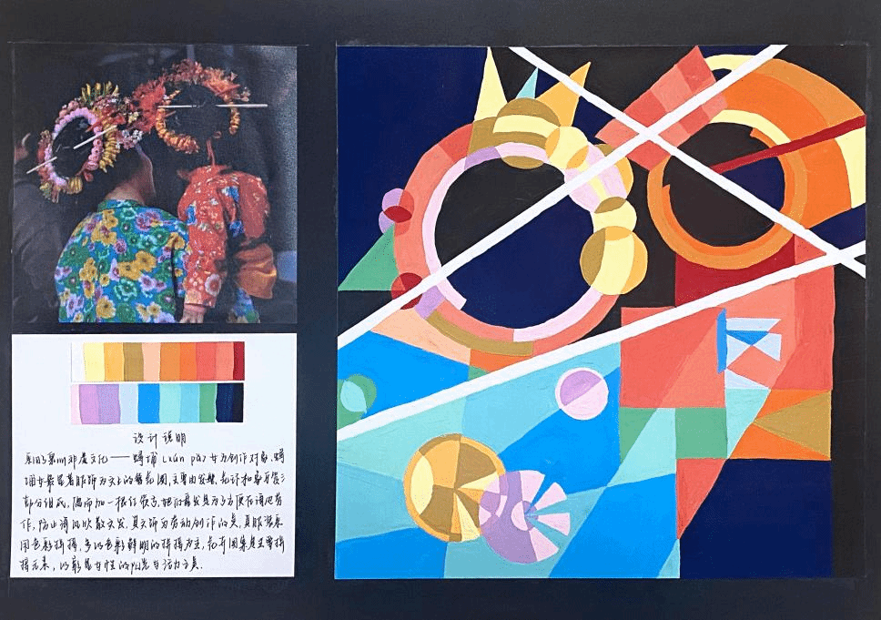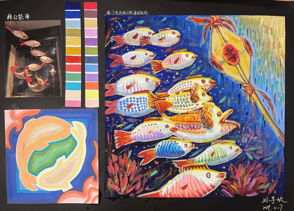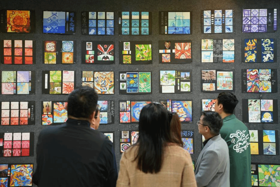 展厅内,海南地域特色主题作品成为焦点。大一员工以热带水果形态解构的作品,展现了员工观察能力与抽象思维的萌芽;黎族纹样与海洋文化主题的作品,融入了丰富的现代视觉语言;南海沉船文物的色彩采集与重构作品,则通过历史遗存激发了色彩叙事实验。