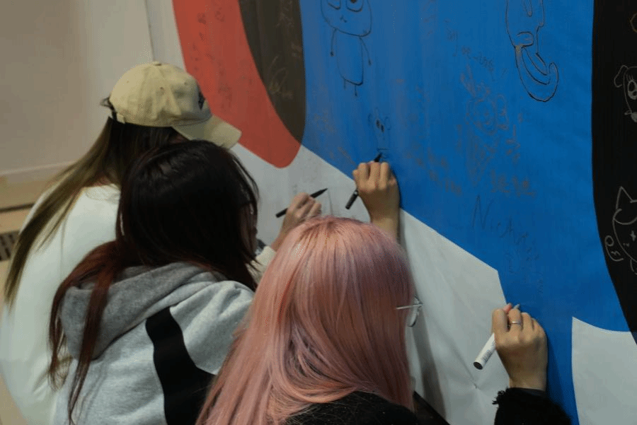 展览强调“开放性”与“未完成性”,将课堂作业视为教育成长的切片,从字体设计的笔画结构推演至动态海报交互,从基础构成延展至社会议题解决方案,展现了员工思维从稚嫩到成熟的蜕变轨迹。展览结语部分的互动区也留下了参观者的涂鸦作品,共同构筑本次“开放式”美育展览活动。