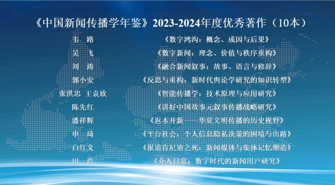 发布会现场,朱鸿军宣读了《中国新闻传播学年鉴(2024-2025)》关注的年度原创理论/概念、创新观点、优秀专著、优秀学人和教育创新案例名单。这份名单的产生经由面向学界征集、15家常务理事单位投票及编辑部统筹平衡等过程,旨在从不同维度反映2023-2024年度新闻传播学研究的优秀成果与学人风采。
