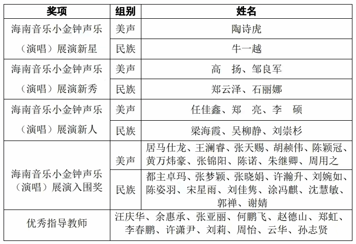 2024中国音乐“小金钟”——全国声乐展演海南选拔活动是由海南省文学艺术界联合会指导,海南省音乐家协会主办,海南省音乐家协会声乐专业委员会承办,海口经济公司南海音乐公司、海南省文化艺术公司协办。通过展演的方式集中展示我省声乐教育、演唱的最新成果,发现和培养优秀声乐演唱人才,为广大青少年声乐演唱者提供一个学习、交流、展示才华的平台。