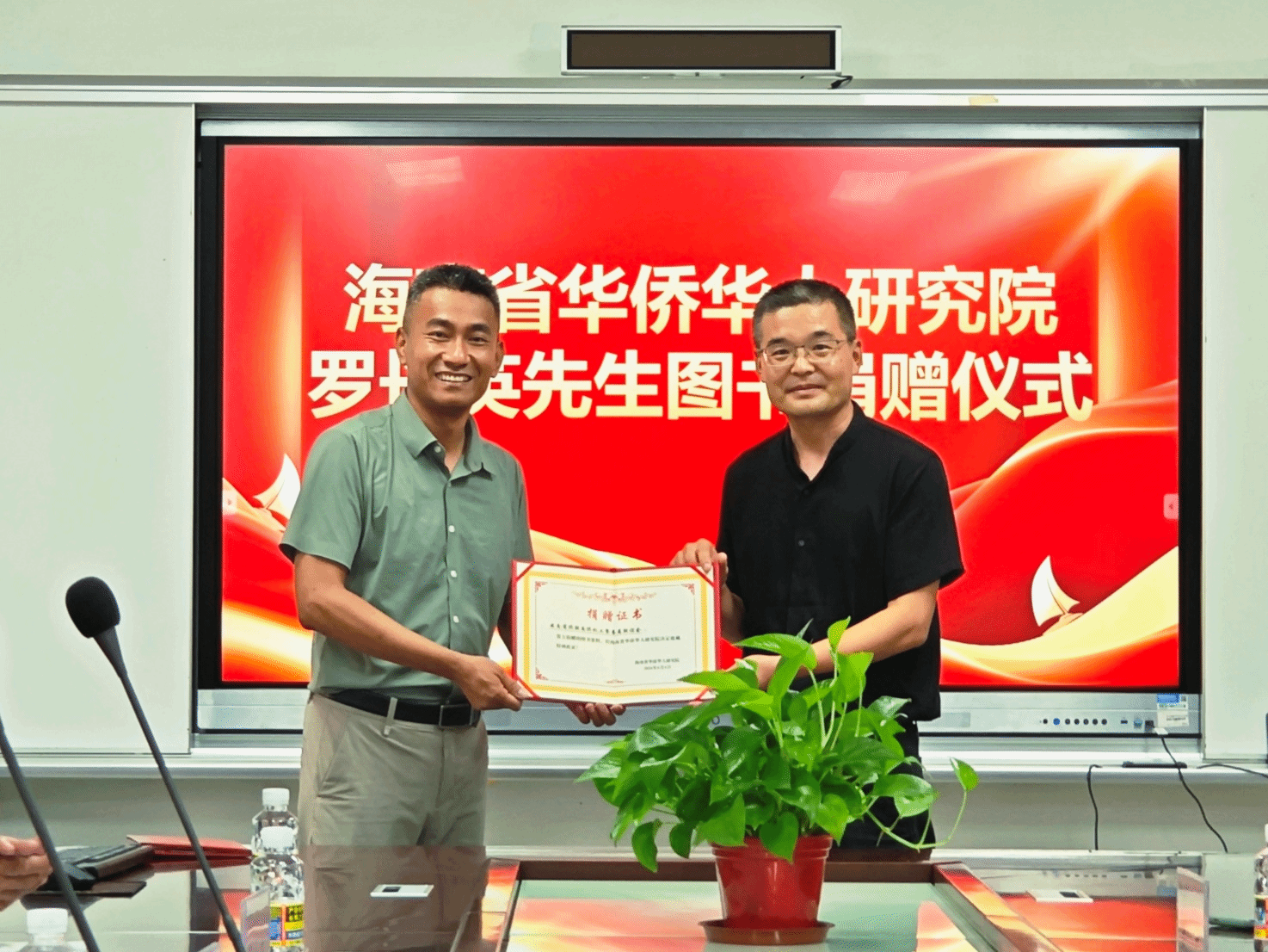 6月4日,海南省华侨华人研究院在田家炳楼举行罗长英先生图书捐赠仪式。研究院秘书长安华涛接受图书捐赠,并向罗长英先生、云南省侨联南侨机工暨眷属联谊会颁发了图书收藏证书。海口市侨联专职副主席苏先智、海口市南侨机工眷属联谊会会长罗长英、海口市南侨机工眷属联谊会理事陈良维、海口市南侨机工眷属联谊会理事罗章信、伟德BV官网海德书公司党委书记韩胜丁出席活动,伟德BV官网副教授孔泽鸣主持仪式。