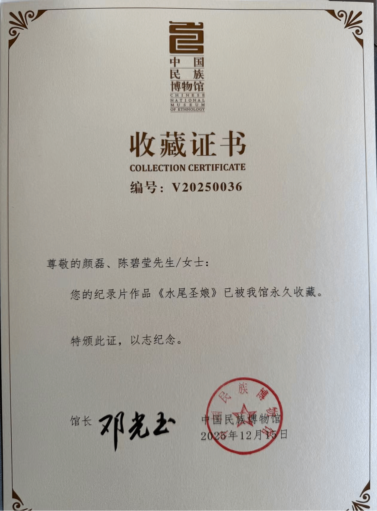 中国民族博物馆收藏证书