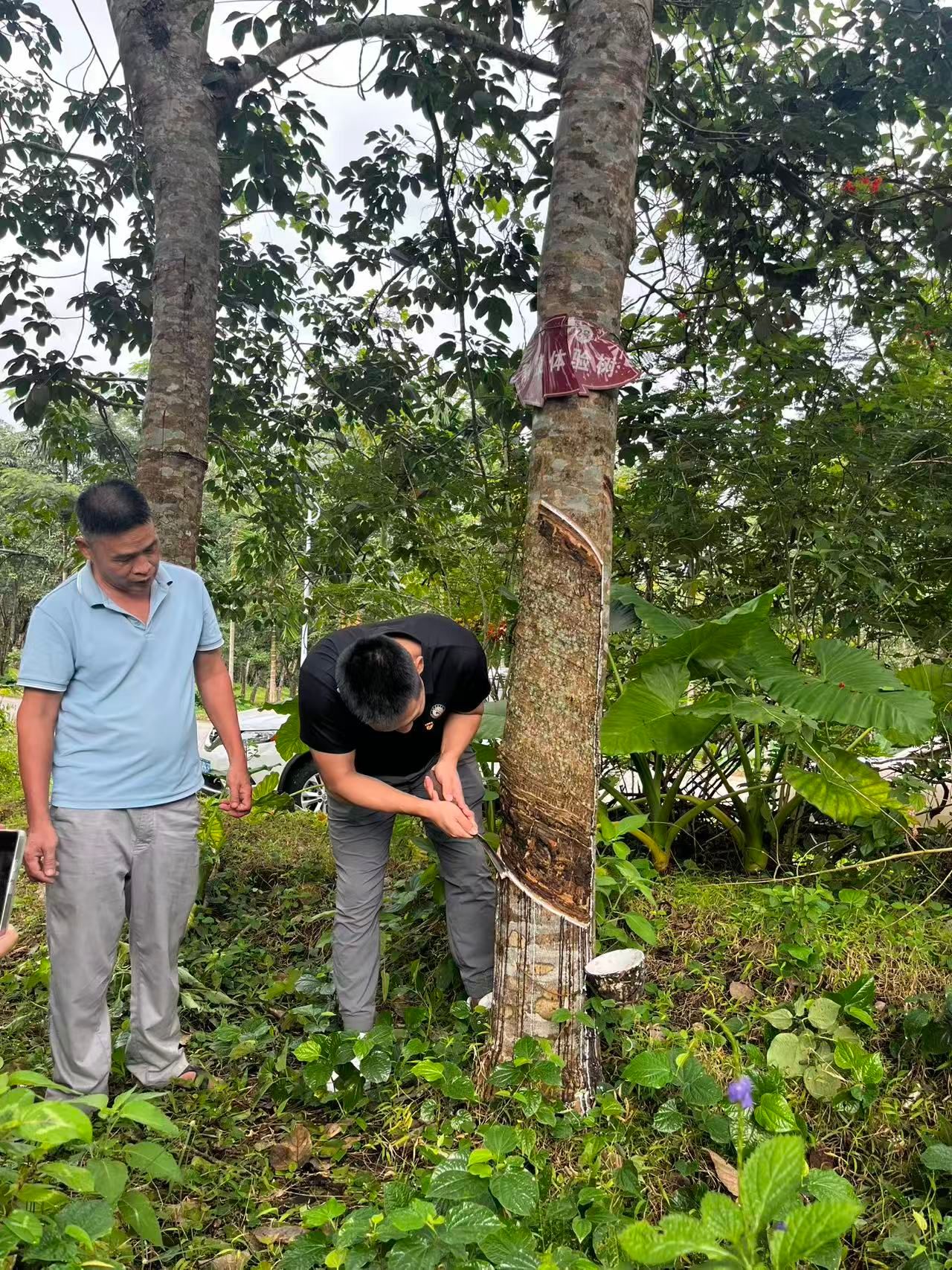 次日,党员们前往联昌教育基地。原两院离退休工作处处长陈海青为党员们带来题为“应国家战略而生,为国家使命而战”的专题党课。他深情讲述了1958年何康老董事长创办热作两院,为打破美帝国主义经济封锁、打破北纬18-24°不可能大面积种植橡胶神话的初衷。党课弘扬了“丹心耀南疆”的爱国奉献精神、“草庐创伟业”的艰苦奋斗精神以及“敢闯敢试”的改革创新精神,让党员们对中国橡胶科研事业的发展历程和重大意义有了更深层次的认识。在专业技术人员的指导下,党员们学习了割胶技术的基本要领,并亲自体验了割胶过程。